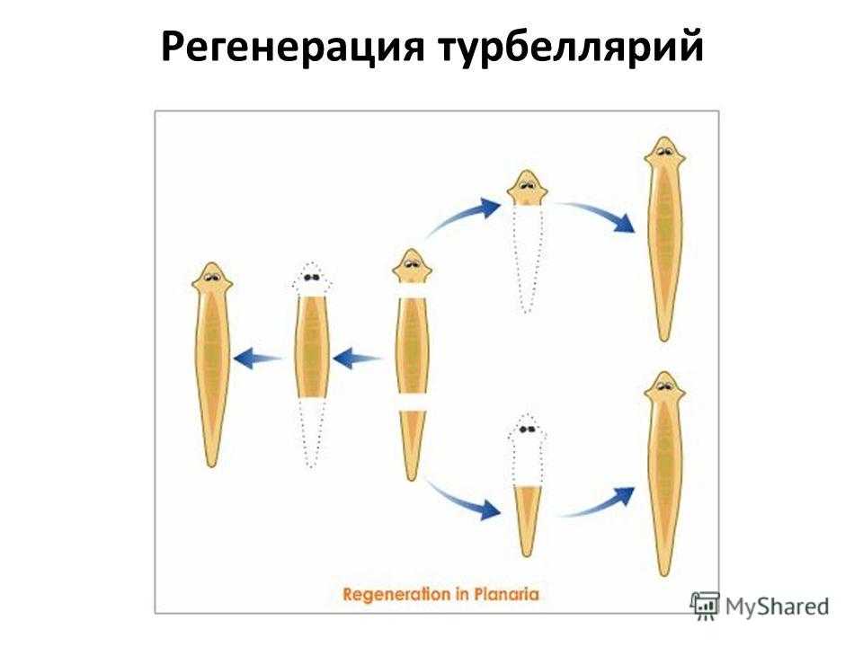 У планарий также есть бесполый способ размножения — за счёт поперечного деления червя пополам. Потом, из каждой такой половинки восстанавливается целая планария.