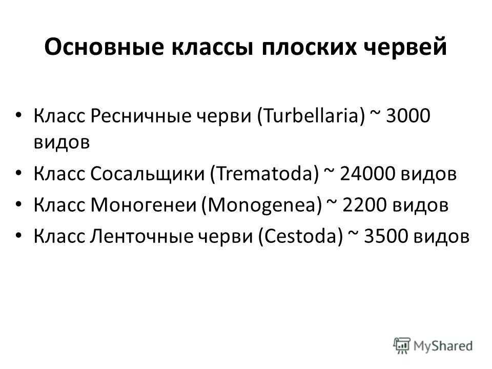 Основные классы плоских червей Класс Ресничные черви (Turbellaria) ~ 3000 видов Класс Сосальщики (Trematoda) ~ видов Класс Моногенеи (Monogenea) ~ 2200 видов Класс Ленточные черви (Cestoda) ~ 3500 видов