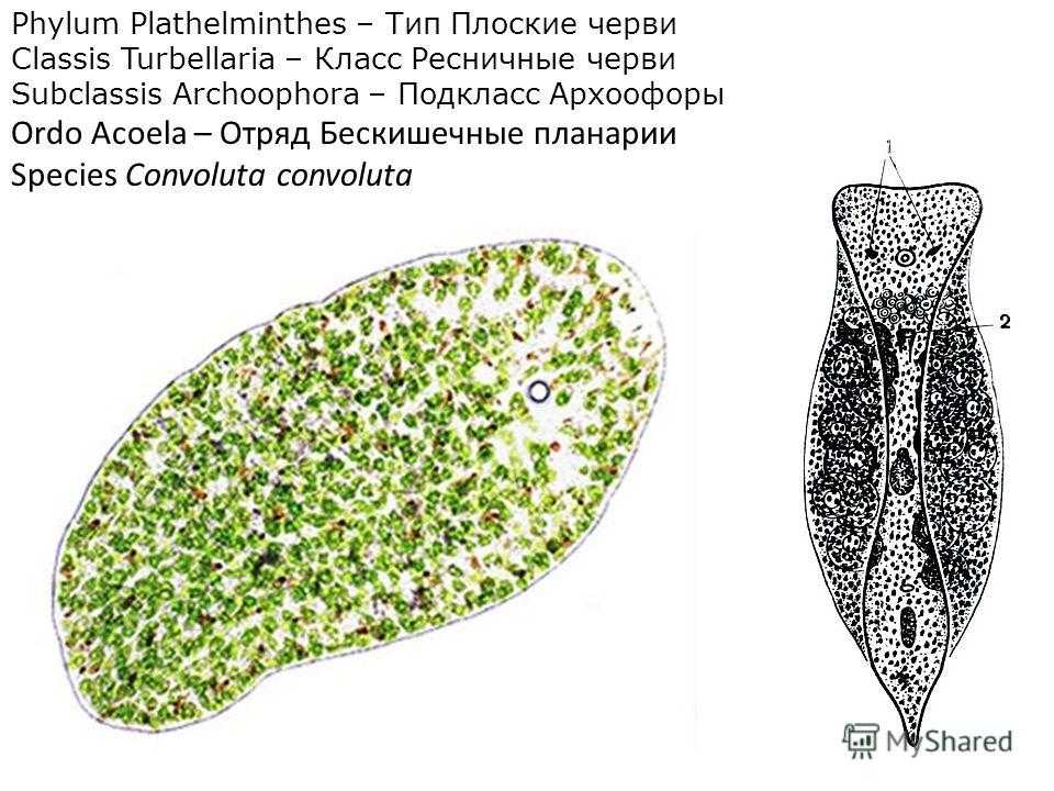 Phylum Plathelminthes – Тип Плоские черви Classis Turbellaria – Класс Ресничные черви Subclassis Archoophora – Подкласс Архоофоры Ordo Acoela – Отряд Бескишечные планарии Species Convoluta convoluta