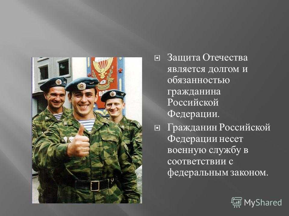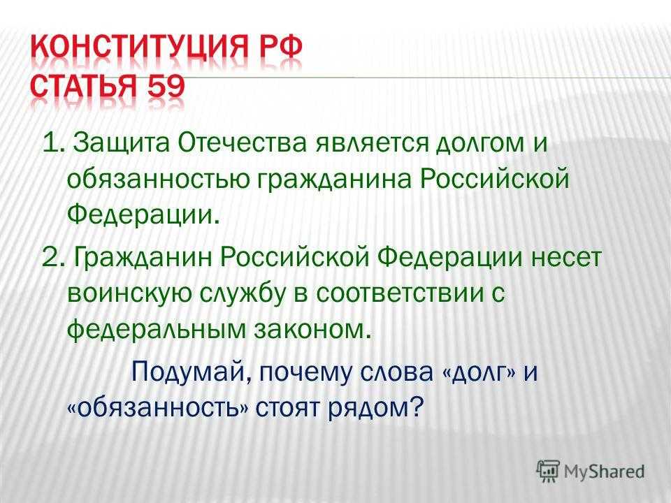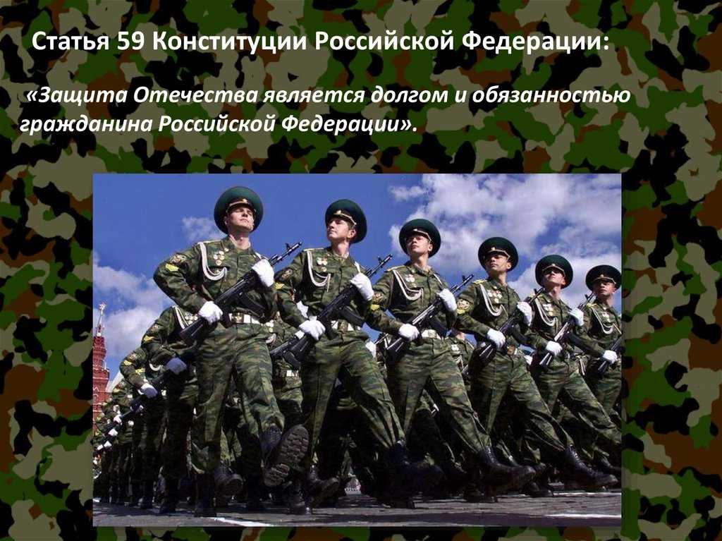 В Конституции, в статье 59, говорится о том, что защита Отечества является долгом и обязанностью граждан Российской Федерации и граждане должны нести военную службу в соответствии с федеральным законом. Это является законом, но, кроме того, защита Родины – это часть патриотического воспитания каждого мужчины в России, часть ответственности, которую несет каждый гражданин Российской Федерации перед собственной Родиной. Защита своей родины – это не формализм. Обязанность каждого гражданина состоит в защите того наследства, которое досталось российским людям от предков и передаче всего, что имеется: природные богатства, культурное наследие, язык, – всего, что нажито цивилизацией, будущим поколениям. Именно поэтому в России существует регулярная армия и называется она так потому, что является правильно организованной, подчиняющейся специальному воинскому законодательству.