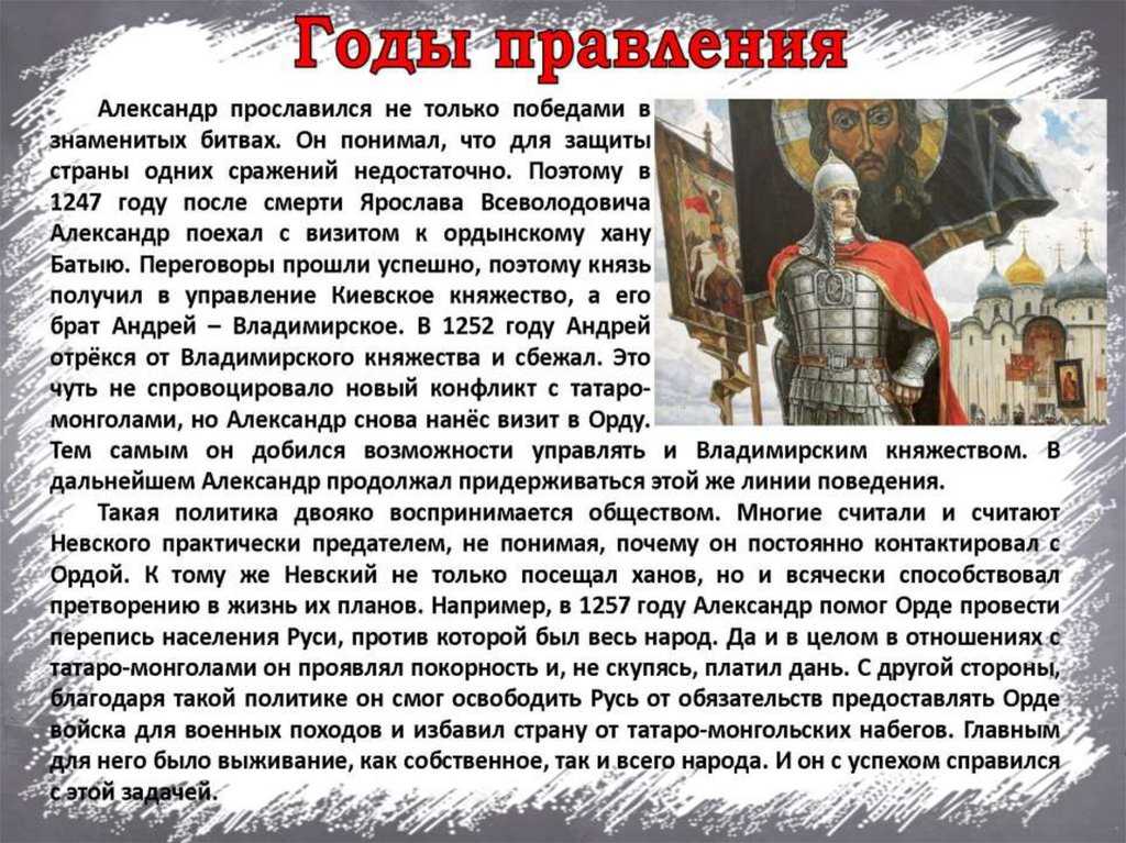В те времена Русь находилась под властью Золотой Орды. Русские князья должны были подтверждать в Орде право на княжение. Хан Батый дал Александру Киев, разоренный монголо-татарами. Мудрое правление великого князя Александра продолжалось, Русь сохраняла свою веру, свои традиции, хотя и стонала под татарским игом.