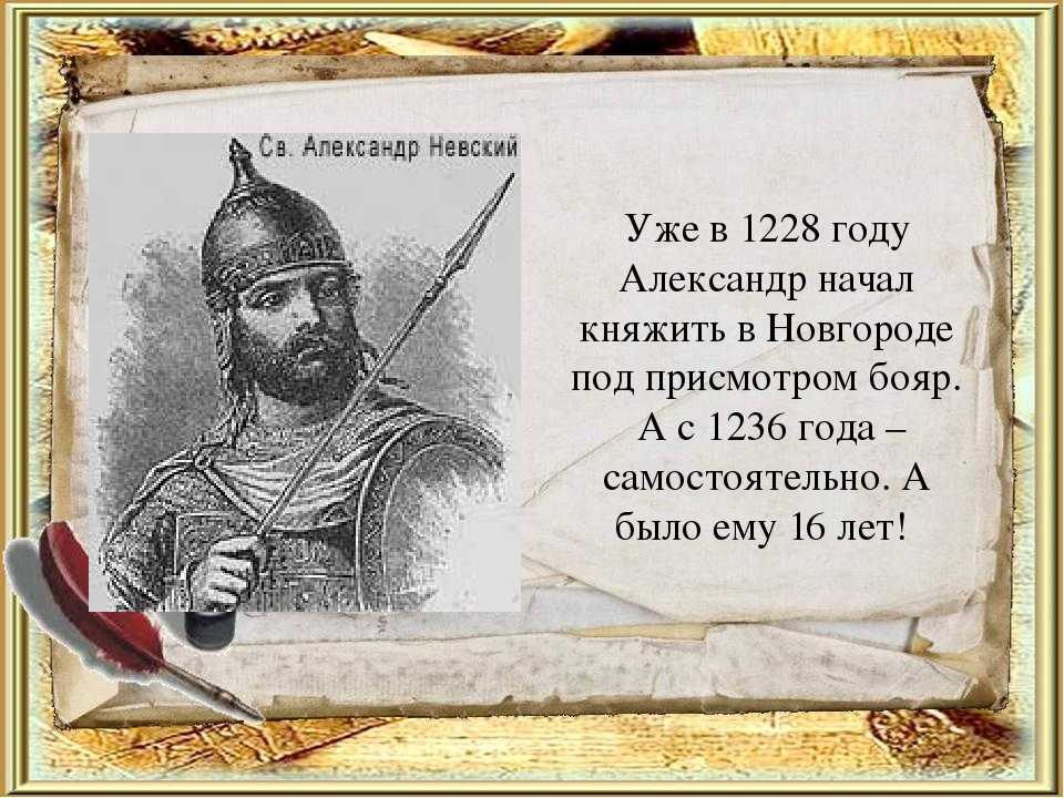 Уже с 1228 года юный Александр начал княжить в Новгороде со своим старшим братом Федором под присмотром бояр, а в 1236 году Александр княжил уже самостоятельно. Народ восхищался своим князем — умным, красивым, высоким, с сильным голосом, гремевшим, как труба.