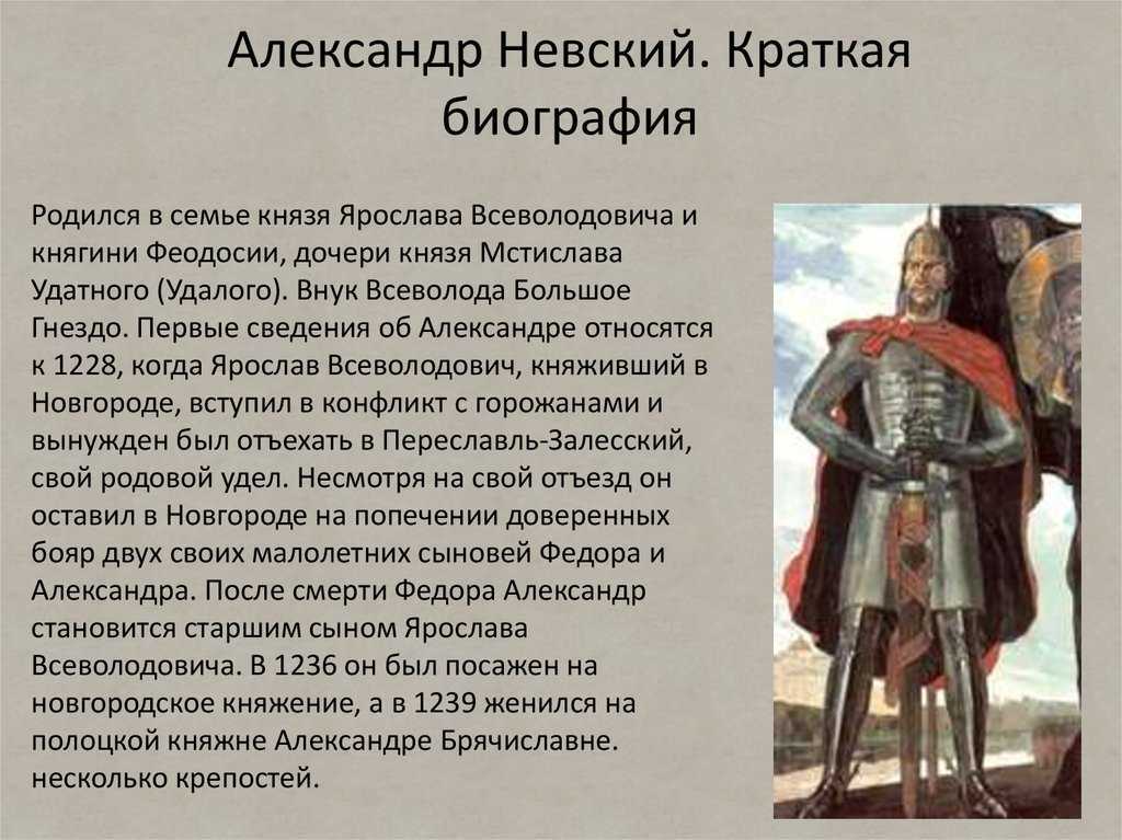 Александр Ярославович родился в Переславле-Залесском в 1221 году в семье князя Ярослава Всеволодовича и княгини Феодосии. Уже с четырех лет ребёнка отлучили от матери и отдали на воспитание княжеским воинам. Малыша начали учить военному делу и грамоте. Он вырос, превратился в ловкого, сильного юношу, который любил читать и прекрасно писал.