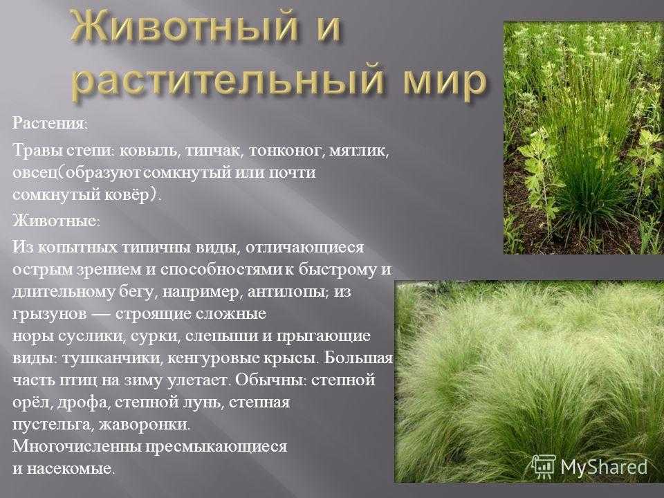 Высокие травы, достигающие 1,5 м, растут только вблизи источников воды. По мере приближения к пустыням растительность видоизменяется и теряет свою высоту. Характеристика некоторых видов степных растений: