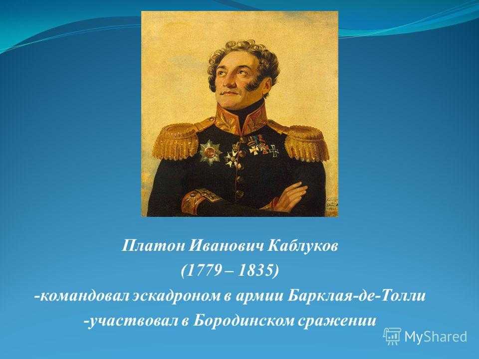 Платон Иванович Каблуков (1779 – 1835) -командовал эскадроном в армии Барклая-де-Толли -участвовал в Бородинском сражении