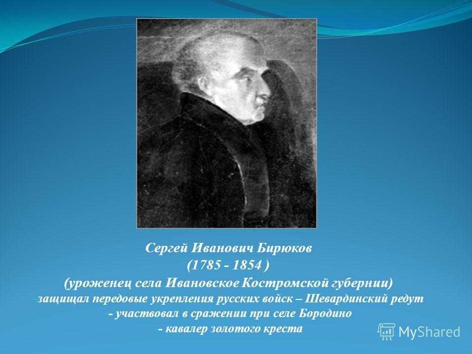 Сергей Иванович Бирюков ( ) (уроженец села Ивановское Костромской губернии) — защищал передовые укрепления русских войск – Шевардинский редут — — участвовал в сражении при селе Бородино — — кавалер золотого креста