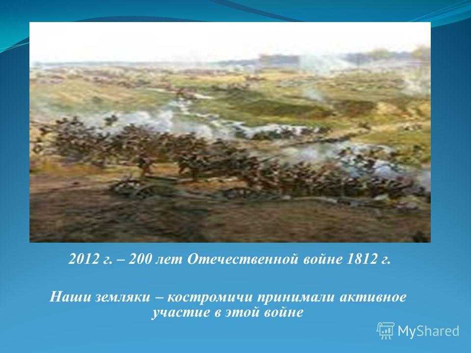 2012 г. – 200 лет Отечественной войне 1812 г. Наши земляки – костромичи принимали активное участие в этой войне