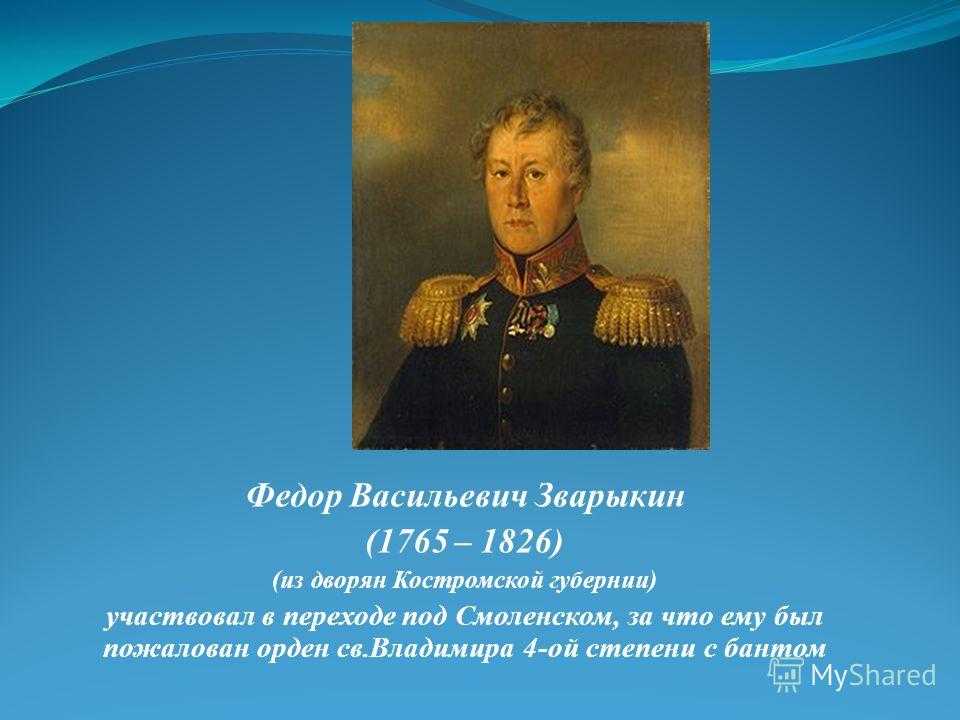 Федор Васильевич Зварыкин (1765 – 1826) (из дворян Костромской губернии) участвовал в переходе под Смоленском, за что ему был пожалован орден св.Владимира 4-ой степени с бантом