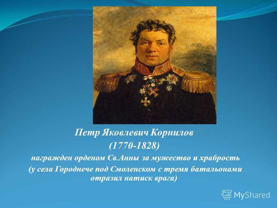 Петр Яковлевич Корнилов ( ) — награжден орденом Св.Анны за мужество и храбрость — (у села Городнече под Смоленском с тремя батальонами отразил натиск врага)