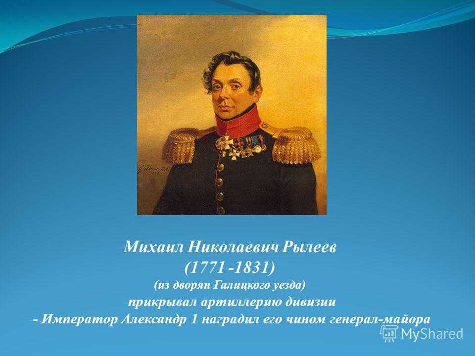 Михаил Николаевич Рылеев ( ) (из дворян Галицкого уезда) — прикрывал артиллерию дивизии — — Император Александр 1 наградил его чином генерал-майора