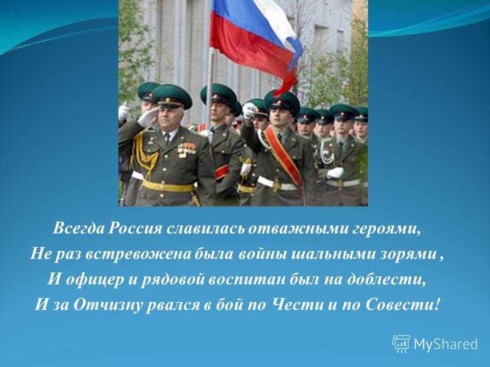 Всегда Россия славилась отважными героями, Не раз встревожена была войны шальными зорями, И офицер и рядовой воспитан был на доблести, И за Отчизну рвался в бой по Чести и по Совести!
