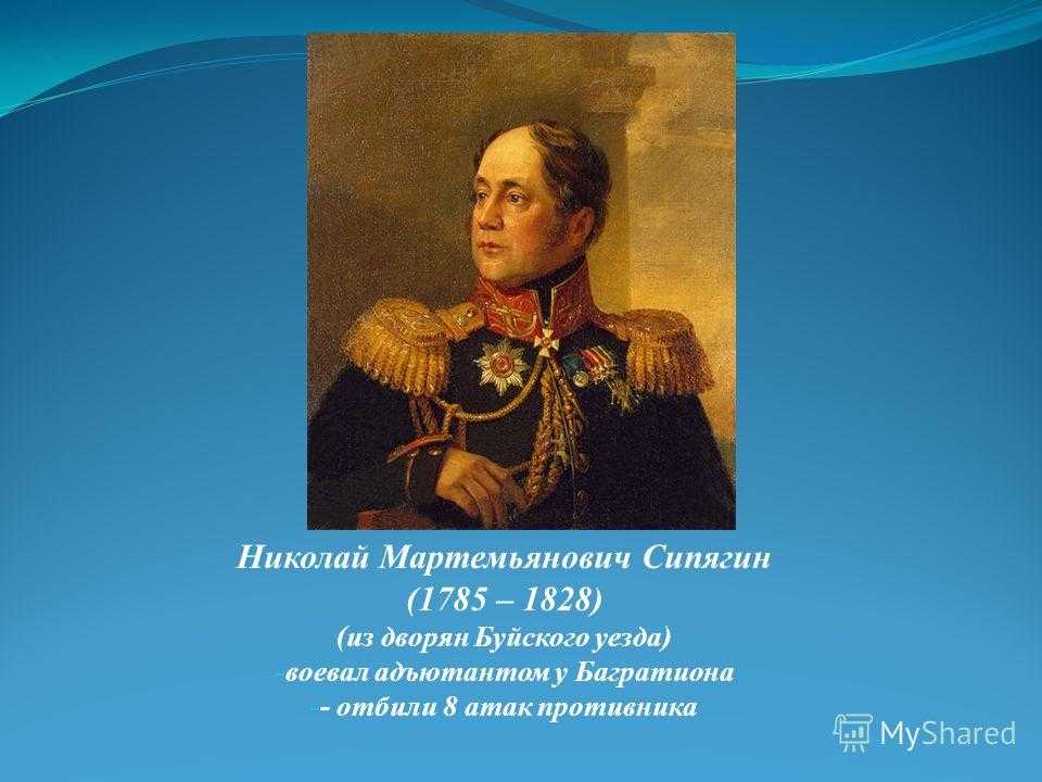 Николай Мартемьянович Сипягин (1785 – 1828) (из дворян Буйского уезда) — воевал адъютантом у Багратиона — — отбили 8 атак противника