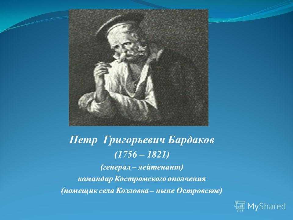 Петр Григорьевич Бардаков (1756 – 1821) (генерал – лейтенант) командир Костромского ополчения (помещик села Козловка – ныне Островское)