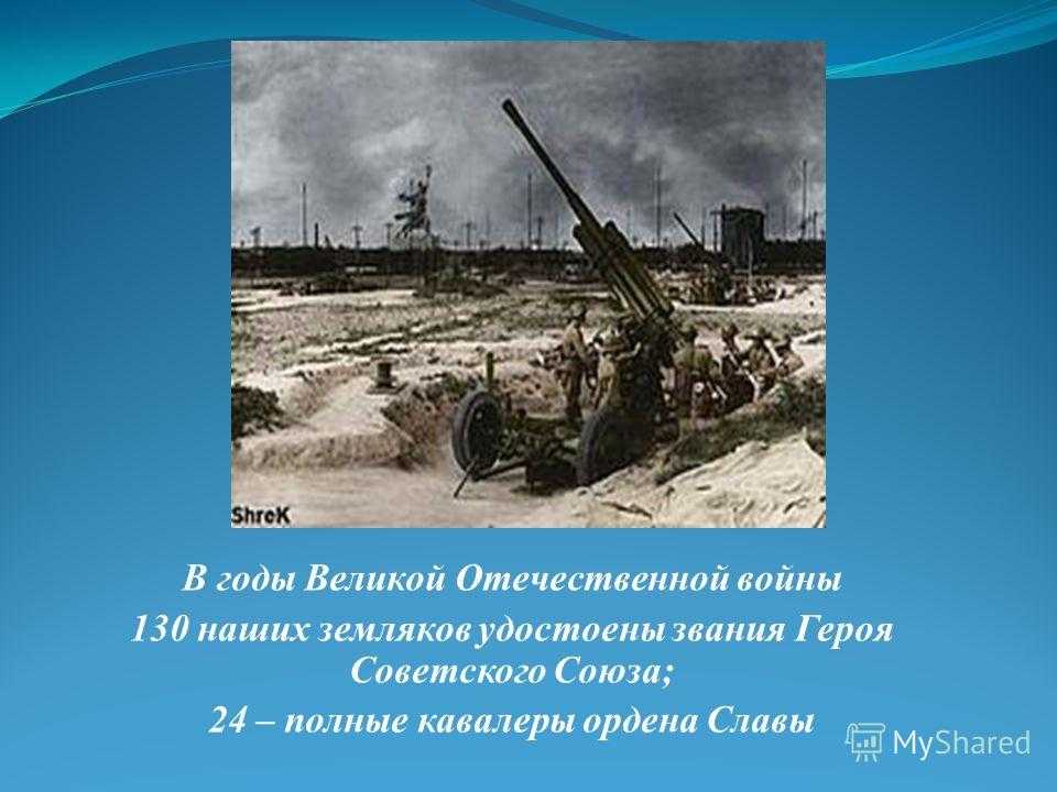 В годы Великой Отечественной войны 130 наших земляков удостоены звания Героя Советского Союза; 24 – полные кавалеры ордена Славы