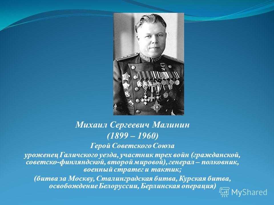 Михаил Сергеевич Малинин (1899 – 1960) Герой Советского Союза уроженец Галичского уезда, участник трех войн (гражданской, советско-финляндской, второй мировой), генерал – полковник, военный стратег и тактик; (битва за Москву, Сталинградская битва, Курская битва, освобождение Белоруссии, Берлинская операция)