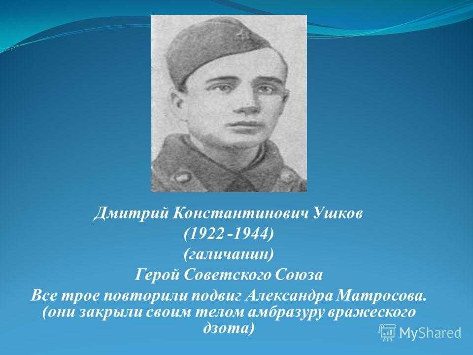 Дмитрий Константинович Ушков ( ) (галичанин) Герой Советского Союза Все трое повторили подвиг Александра Матросова. (они закрыли своим телом амбразуру вражеского дзота)
