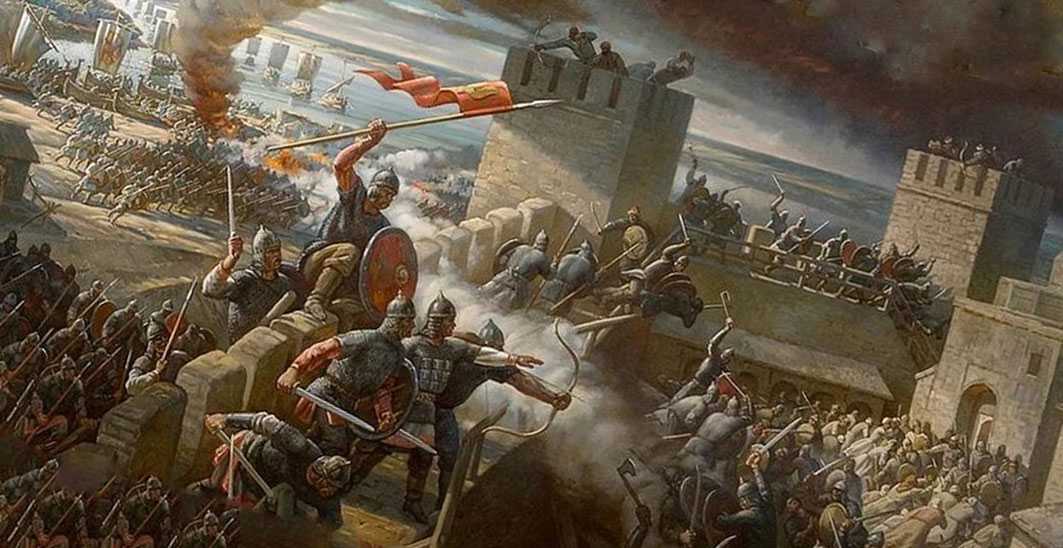 Пока его воины разграбляли незащищенные высокими стенами пригороды, Олег Вещий придумал ставшую легендарной тактическую хитрость — приказал вытащить корабли на берег, поставить их на колёса и так, при попутном ветре, вся армия двинулась к стенам Царьграда.