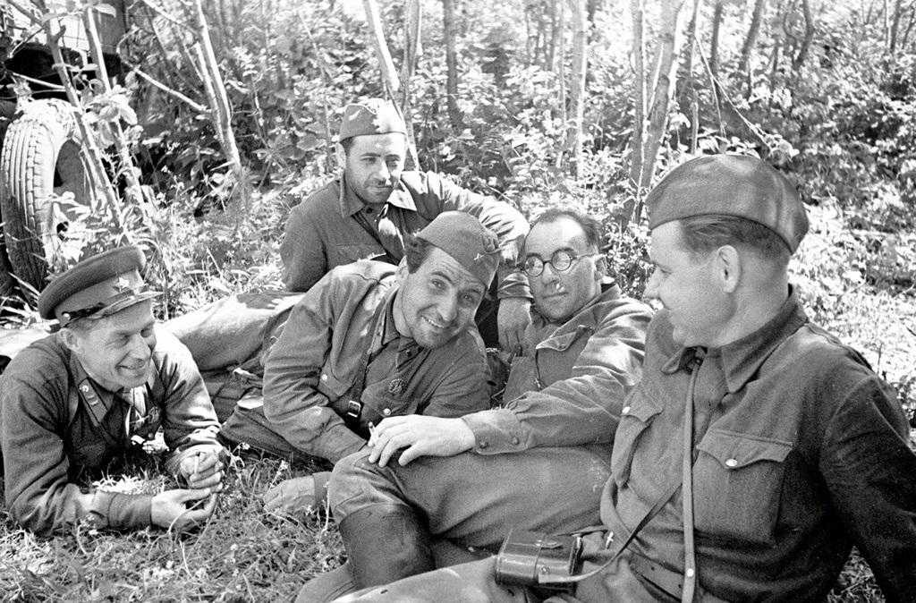 Военкоры на привале. Слева направо Алексей Сурков, Константин Симонов, Евгений Кригер. Фото П. Трошкина. Июль 1941