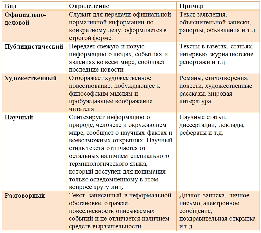 В жизни каждый встречался со всеми этими стилями. По данным признакам их не трудно определить, достаточно знать, какие средства выразительности присущи тому или иному типу.