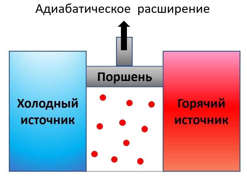 Рабочее тело, расширяясь, заставляет поршень двигаться вверх. Давление газа под поршнем постепенно снижается. Выталкивая подвижный поршень вверх, рабочее тело совершает механическую работу, в результате чего теряет определенное количество внутренней энергии. Количество этой энергии равно проделанной работе A = -∆U. В процессе расширения рабочего тела его температура уменьшается и становится равной TХ.