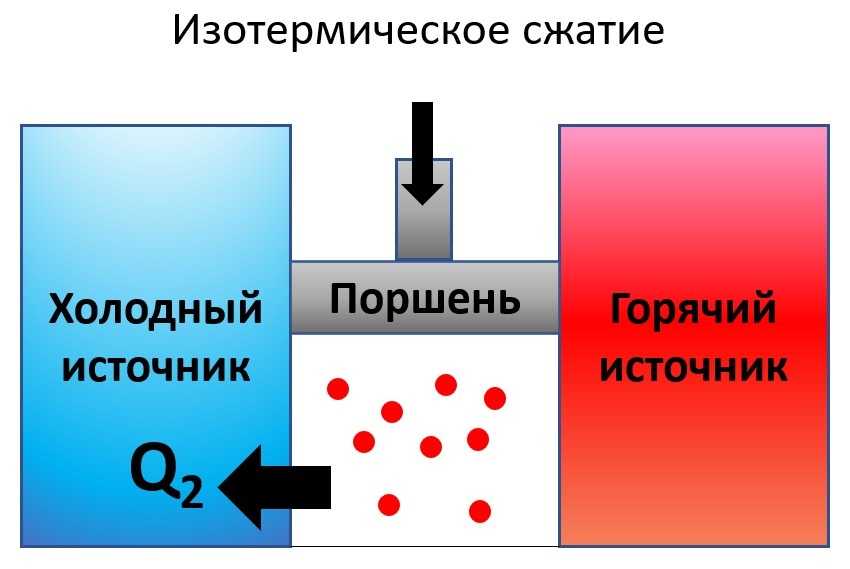 Процесс сжатия осуществляется при постоянной температуре Tc и отводе тепла от системы. Температура поддерживается постоянной следующим образом: снижение температуры из-за отвода тепла компенсируется увеличением температуры из-за сжатия.