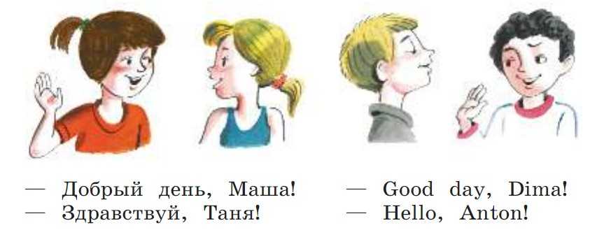 На первом рисунке девочки общаются на русском языке. На втором рисунке мальчики разговаривают на английском языке. Я понял это, потому что отличается состав слов, т. е. символы, с помощью которых слова записаны.Русский: Добрый день, здравствуй, Маша, Таня.Английский: Good day, Hello, Dima, Anton.