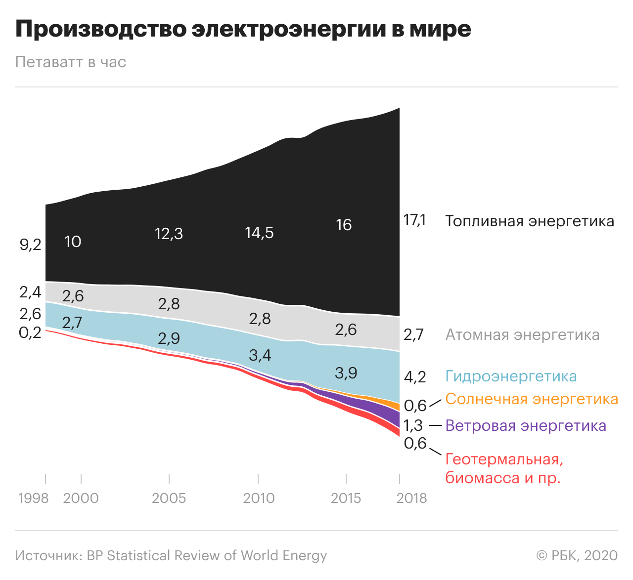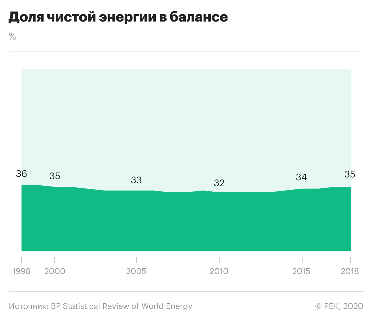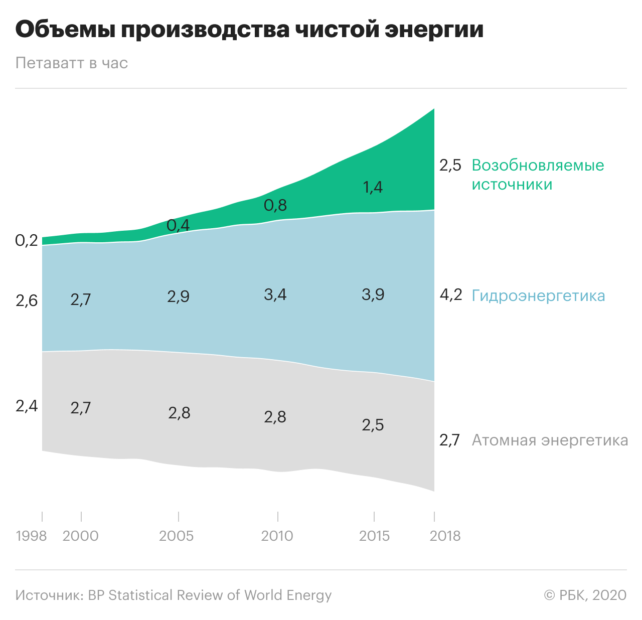 За последние 20 лет объемы чистой энергии увеличились в два раза. Это энергия, полученная из экологически чистых источников — гидроэлектроэнергия, атомная, солнечная, ветровая, геотермальная, приливная, энергия биомассы. Однако ее доля в общем объеме добытой энергии осталось прежней и даже немного сократилась — с 36% в 1999 году до 35% в 2018 году.