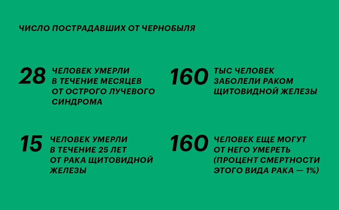 ООН провела комплексные исследования катастрофы в Чернобыле. Взрыв на ЧАЭС — это худшая ядерная авария из всех случившихся. В результате нее погибло 28 человек от острого лучевого синдрома, и еще 15 человек умерло за последующие 25 лет от рака щитовидной железы. 16 тыс. человек заболели после Чернобыля раком щитовидной железы: по оценкам, 160 из них умрет от этого вида рака.
