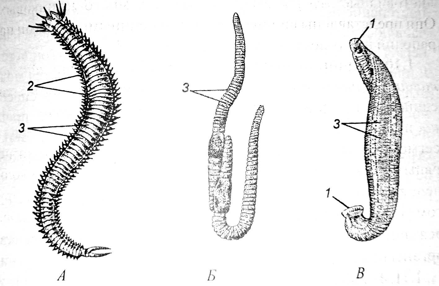 Внешний вид кольчатых червей: А – нереида; Б — дождевые черви в момент осеменения; В — пиявка; 1 — присоски; 2 — параподии; 3 — сегменты тела.