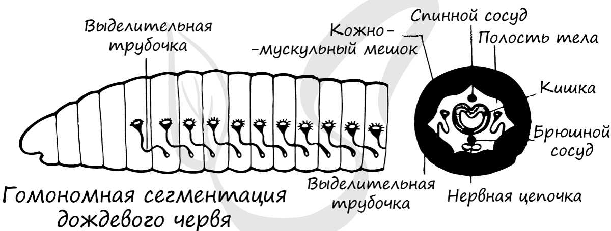 Такую конструкцию можно представить как отсеки в подводной лодке, в каждом из которых есть все необходимое для жизни. При механическом повреждении кольчатый червь способен из небольшого фрагмента тела регенерировать целый организм.