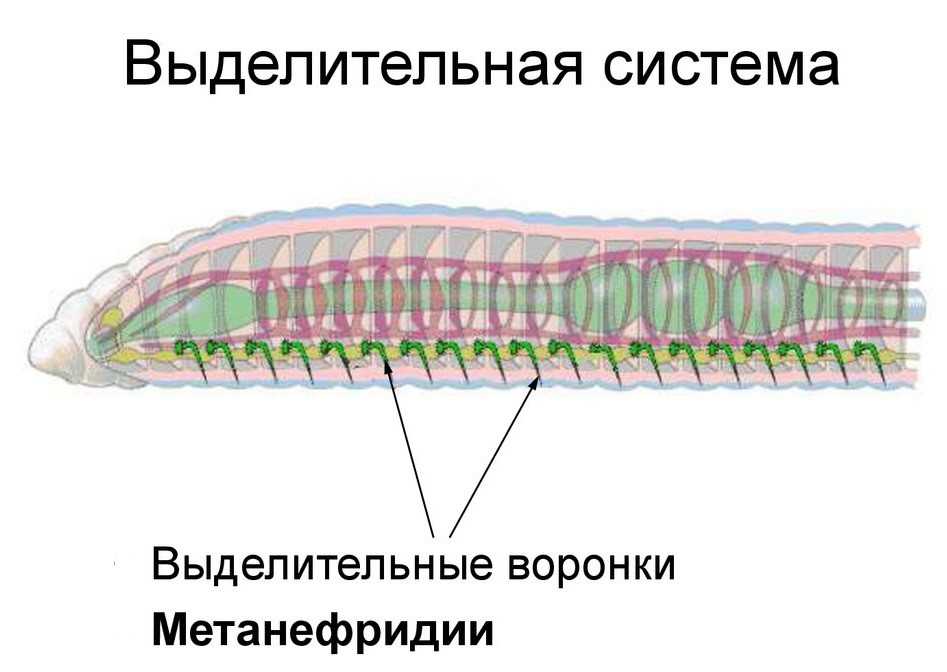 Чаще всего органы выделения представлены метанефридиями. Это парные извилистые железистые трубочки, которые одним концом связаны с целомом, а другим выходят наружу. На каждом сегменте обычно присутствуют по два канальца, которые открываются через поры.