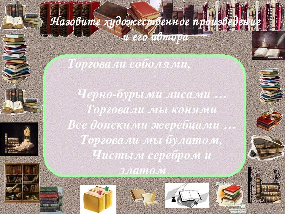 Назовите художественное произведение и его автора Торговали соболями, Черно-бурыми лисами … Торговали мы конями Все донскими жеребцами … Торговали мы булатом, Чистым серебром и златом …