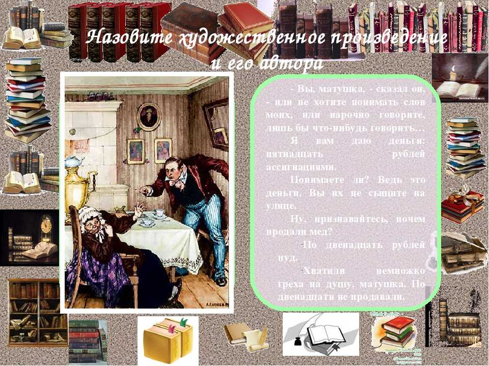 Назовите художественное произведение и его автора … — Вы, матушка, — сказал он, — или не хотите понимать слов моих, или нарочно говорите, лишь бы что-нибудь говорить… Я вам даю деньги: пятнадцать рублей ассигнациями. Понимаете ли? Ведь это деньги. Вы их не сыщите на улице. Ну, признавайтесь, почем продали мед? По двенадцать рублей пуд. Хватили немножко греха на душу, матушка. По двенадцати не продавали.