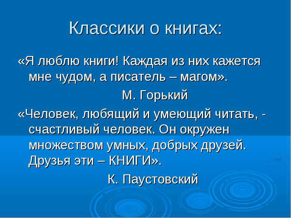 Книга — великое чудо на земле! Она заключает в себе мысли великих людей, передаёт нам их слова через века. А ещё она учит, просвещает, открывает тайны перед нами. Читая любую книгу впервые, мы радуемся новым открытиям. Книга — умный и самый интересный собеседник на свете. Книга — верный товарищ, надёжный помощник, постоянный спутник и преданный друг.