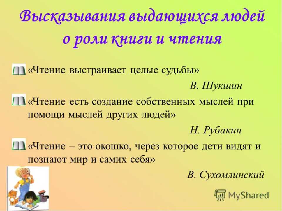 Взяв в руки книгу, мы каждый раз открываем для себя что – то новое, погружается в загадочный, доселе неизведанный мир, знакомимся с новыми людьми, живем их жизнью, вместе с ними радуется и переживаем. Книга нас воспитывает, заставляет творчески мыслить, помогает выбрать правильный жизненный путь, в конце — концов, делает нас добрее и лучше.