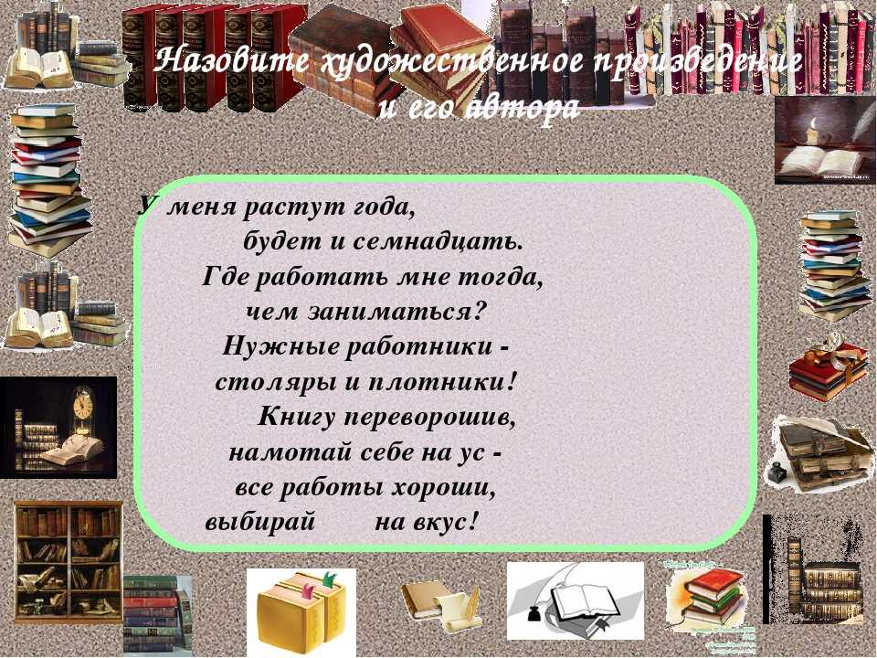 Назовите художественное произведение и его автора У меня растут года, будет и семнадцать. Где работать мне тогда, чем заниматься? Нужные работники — столяры и плотники! Книгу переворошив, намотай себе на ус — все работы хороши, выбирай на вкус!