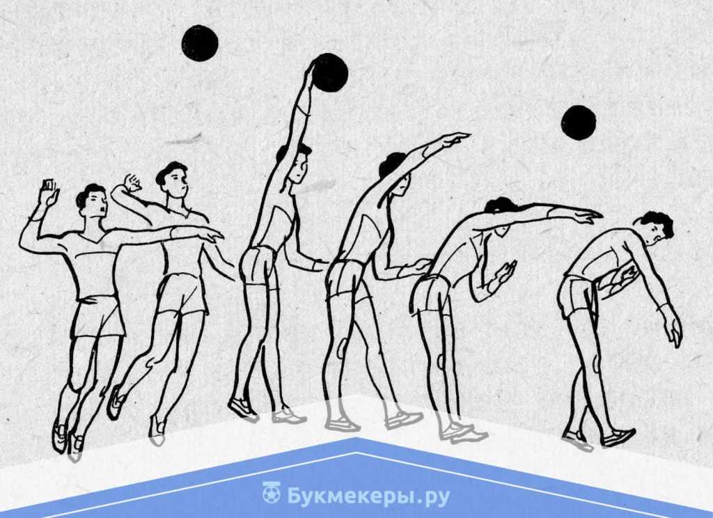 - Взлет – пас напарнику, который в это время уже подпрыгнул и занес руку для удара;