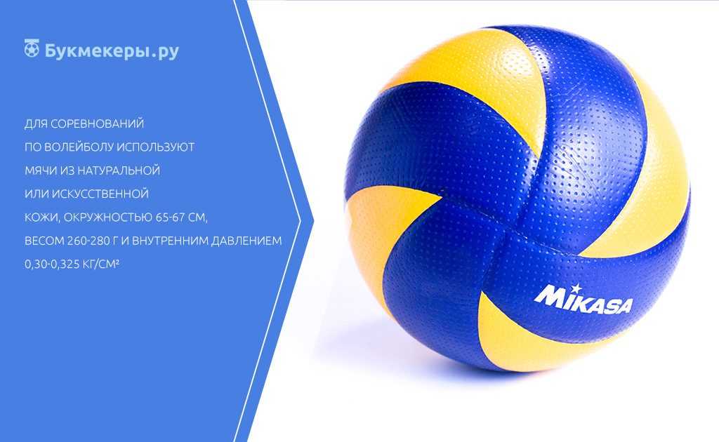 Для соревнований по волейболу используются мячи из натуральной или искусственной кожи, с окружностью 65-67 см, весом 260-280 г и внутренним давлением 0,30-0,325 кг / см²