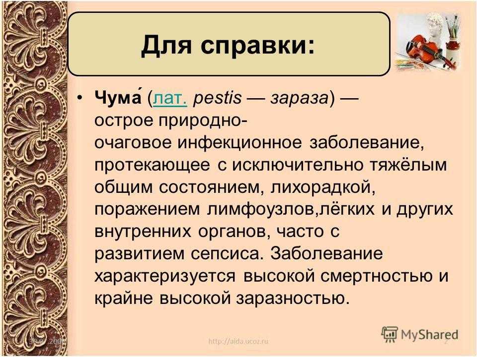 Чума́ (лат. pestis зараза) острое природно- очаговое инфекционное заболевание, протекающее с исключительно тяжёлым общим состоянием, лихорадкой, поражением лимфоузлов,лёгких и других внутренних органов, часто с развитием сепсиса. Заболевание характеризуется высокой смертностью и крайне высокой заразностью.лат. Для справки: