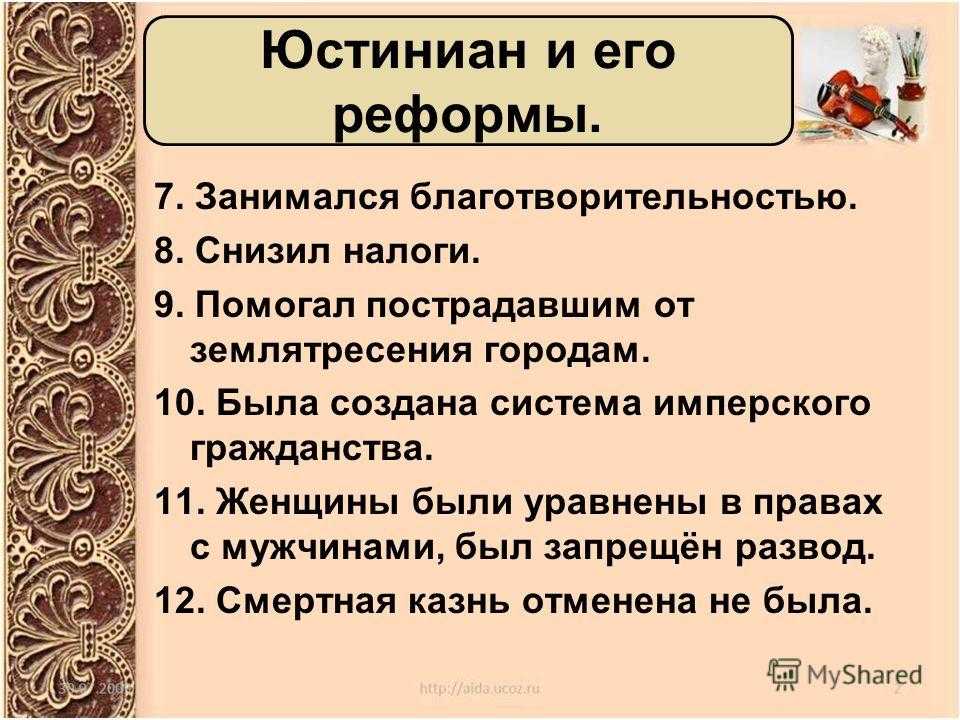 7. Занимался благотворительностью. 8. Снизил налоги. 9. Помогал пострадавшим от землятресения городам. 10. Была создана система имперского гражданства. 11. Женщины были уравнены в правах с мужчинами, был запрещён развод. 12. Смертная казнь отменена не была. Юстиниан и его реформы.