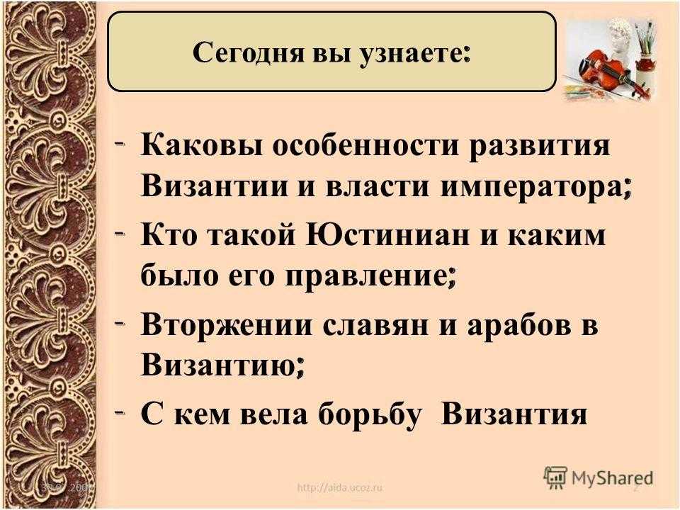 — Каковы особенности развития Византии и власти императора ; — Кто такой Юстиниан и каким было его правление ; — Вторжении славян и арабов в Византию ; — С кем вела борьбу Византия Сегодня вы узнаете :