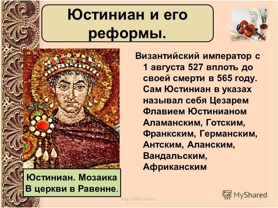 Византийский император с 1 августа 527 вплоть до своей смерти в 565 году. Сам Юстиниан в указах называл себя Цезарем Флавием Юстинианом Аламанским, Готским, Франкским, Германским, Антским, Аланским, Вандальским, Африканским Юстиниан и его реформы. Юстиниан. Мозаика В церкви в Равенне.