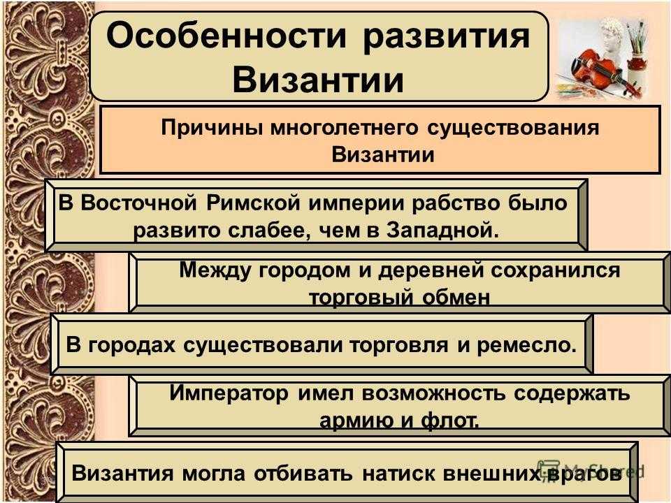 Причины многолетнего существования Византии В Восточной Римской империи рабство было развито слабее, чем в Западной. Между городом и деревней сохранился торговый обмен В городах существовали торговля и ремесло. Император имел возможность содержать армию и флот. Византия могла отбивать натиск внешних врагов