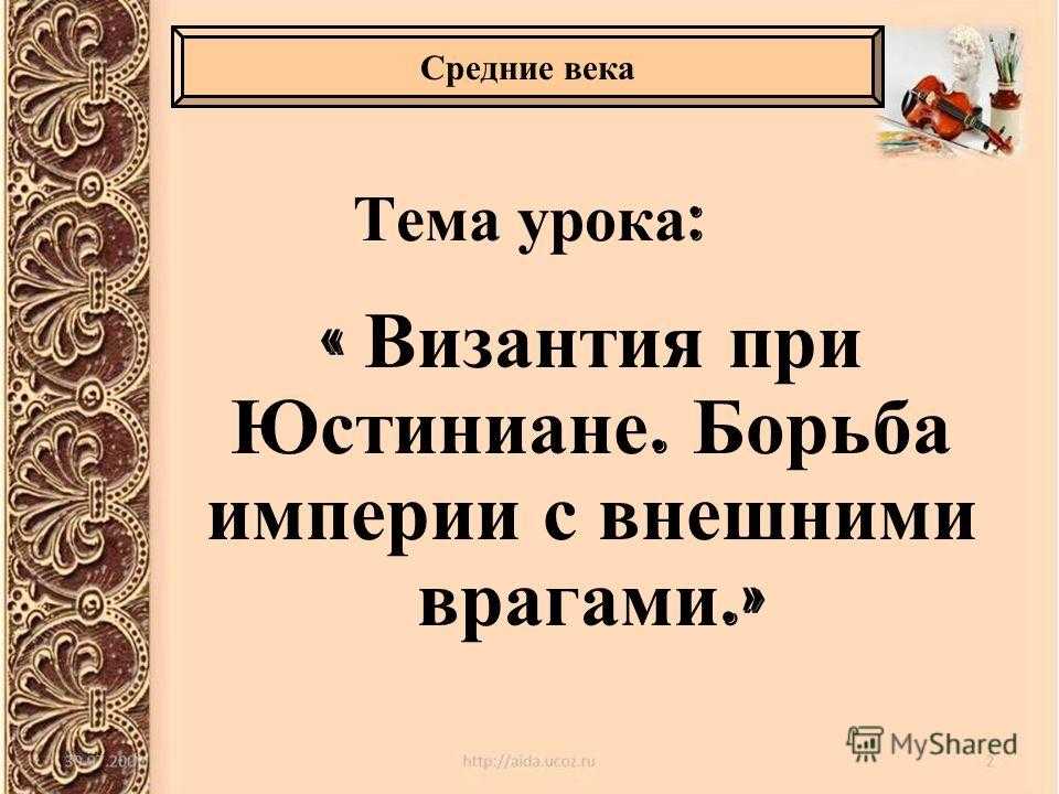 Презентация на тему: » Тема урока : « Византия при Юстиниане. Борьба империи с внешними врагами.» Средние века.» — Транскрипт: