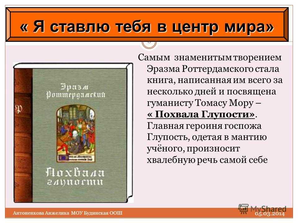 Антоненкова Анжелика МОУ Будинская ООШ 8 Самым знаменитым творением Эразма Роттердамского стала книга, написанная им всего за несколько дней и посвящена гуманисту Томасу Мору – « Похвала Глупости». Главная героиня госпожа Глупость, одетая в мантию учёного, произносит хвалебную речь самой себе « Я ставлю тебя в центр мира»