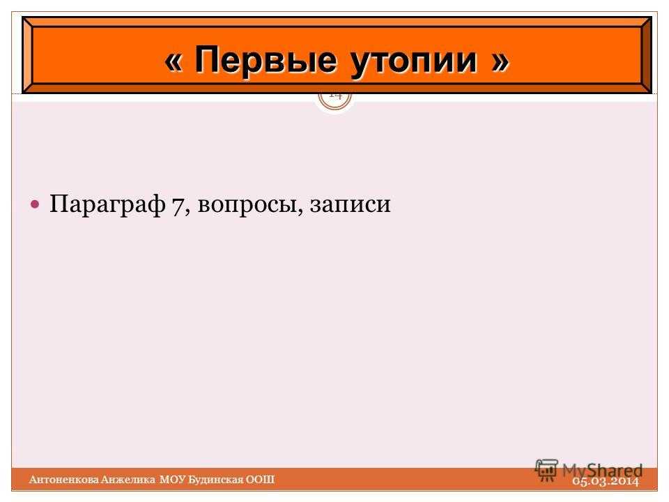 Антоненкова Анжелика МОУ Будинская ООШ 14 Параграф 7, вопросы, записи « Первые утопии »