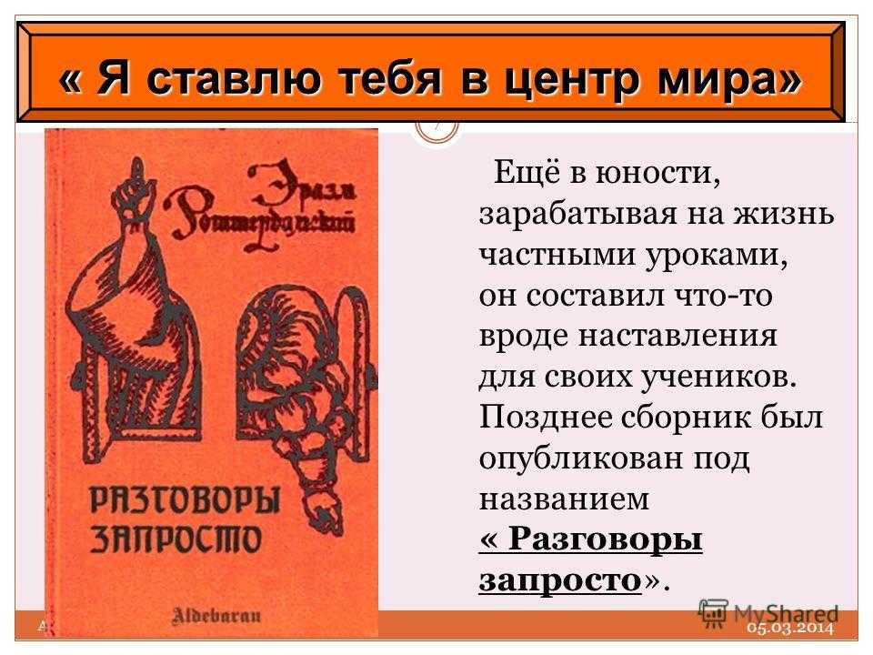 Антоненкова Анжелика МОУ Будинская ООШ 6 Будучи выдающимся знатоком латыни он комментировал сочинения древних писателей, составил сборник греческих и латинских поговорок, давая возможность читателю проникнуть в мир подлинной античной культуры. « Я ставлю тебя в центр мира»