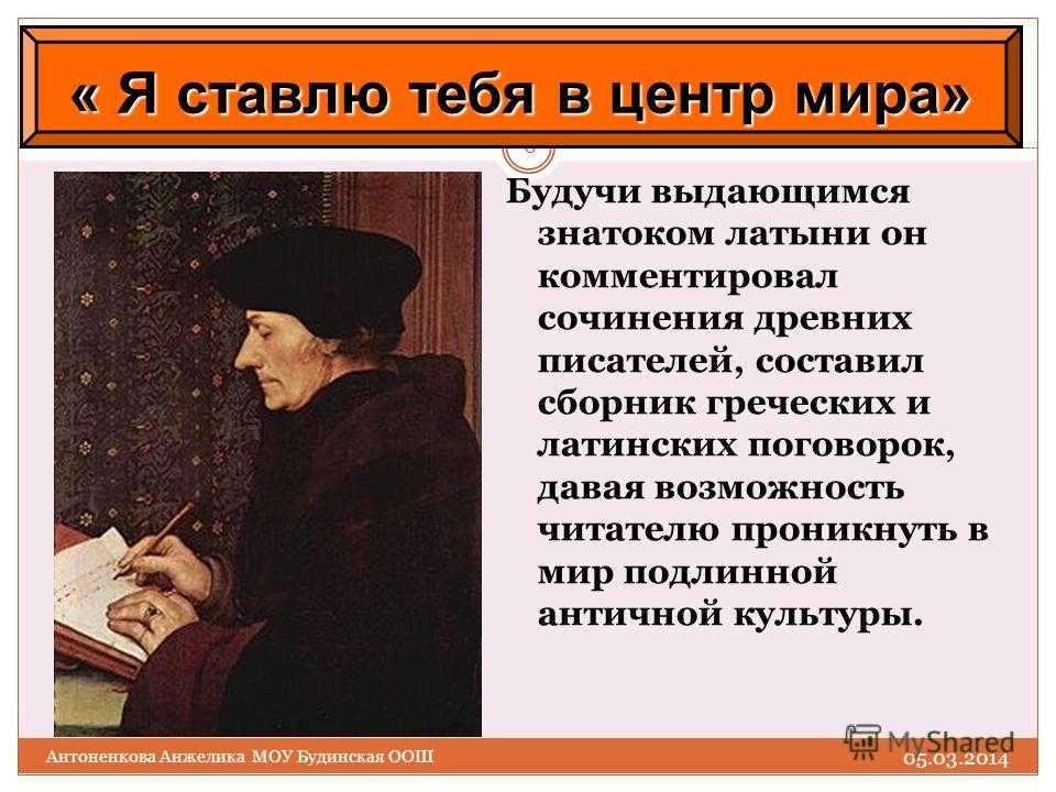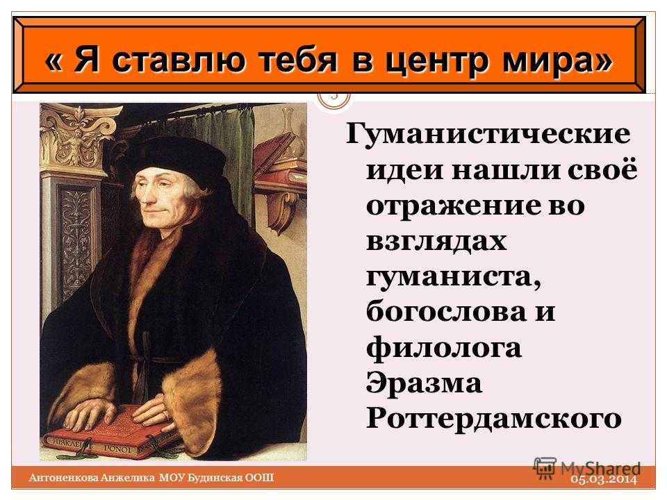 Антоненкова Анжелика МОУ Будинская ООШ 5 « Я ставлю тебя в центр мира» Гуманистические идеи нашли своё отражение во взглядах гуманиста, богослова и филолога Эразма Роттердамского