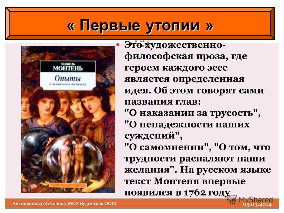 Антоненкова Анжелика МОУ Будинская ООШ 11 Это художественно- философская проза, где героем каждого эссе является определенная идея. Об этом говорят сами названия глав: «О наказании за трусость», «О ненадежности наших суждений», «О самомнении», «О том, что трудности распаляют наши желания». На русском языке текст Монтеня впервые появился в 1762 году « Первые утопии »