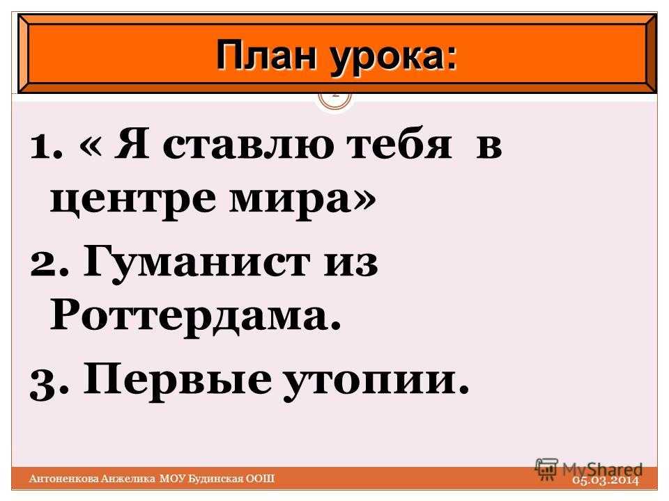 Антоненкова Анжелика МОУ Будинская ООШ 2 1. « Я ставлю тебя в центре мира» 2. Гуманист из Роттердама. 3. Первые утопии. План урока: